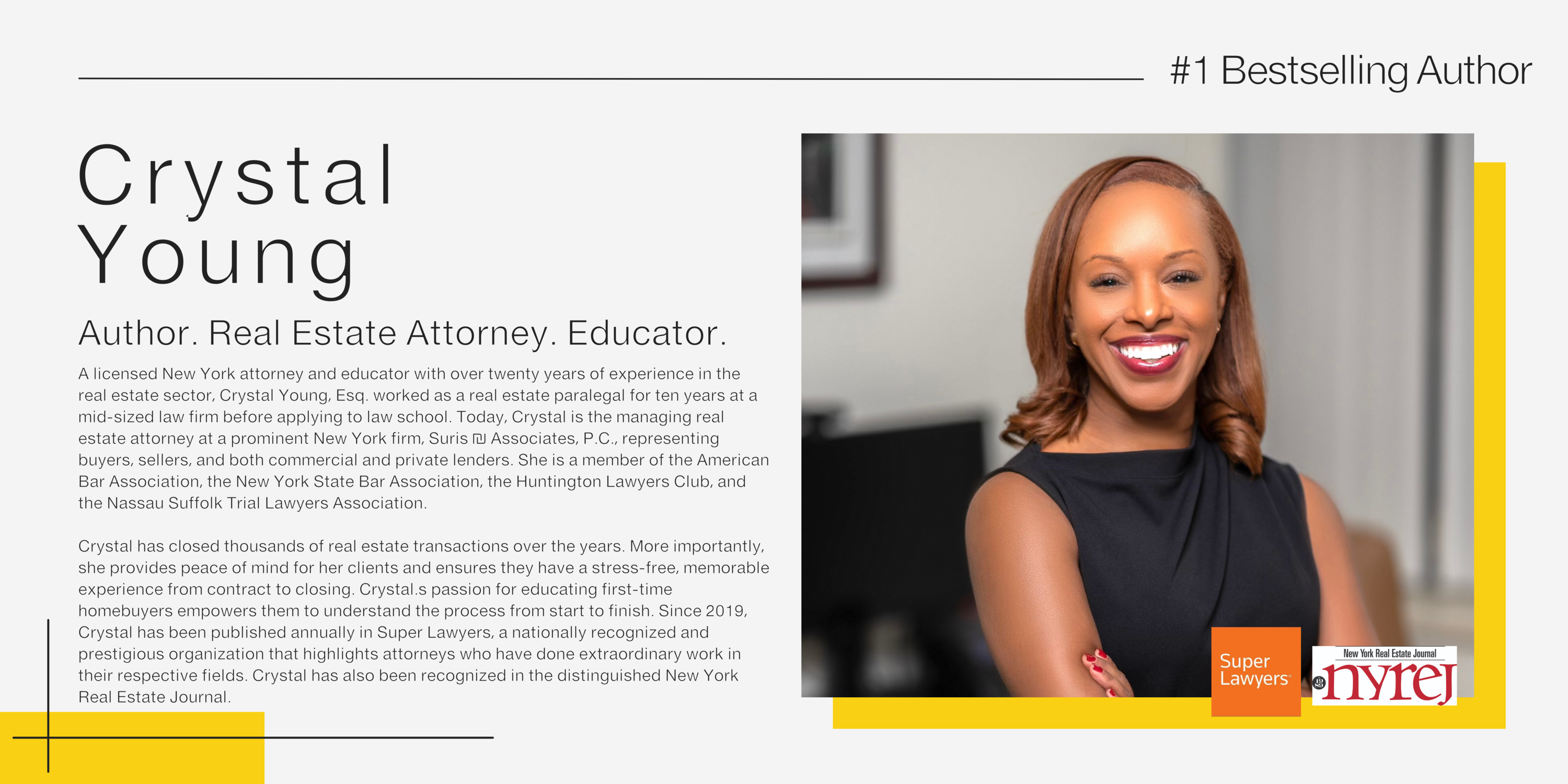 A licensed New York attorney and educator with over twenty years of experience in the real estate sector, Crystal Young, Esq. worked as a real estate paralegal for ten years at a mid-sized law firm before applying to law school.